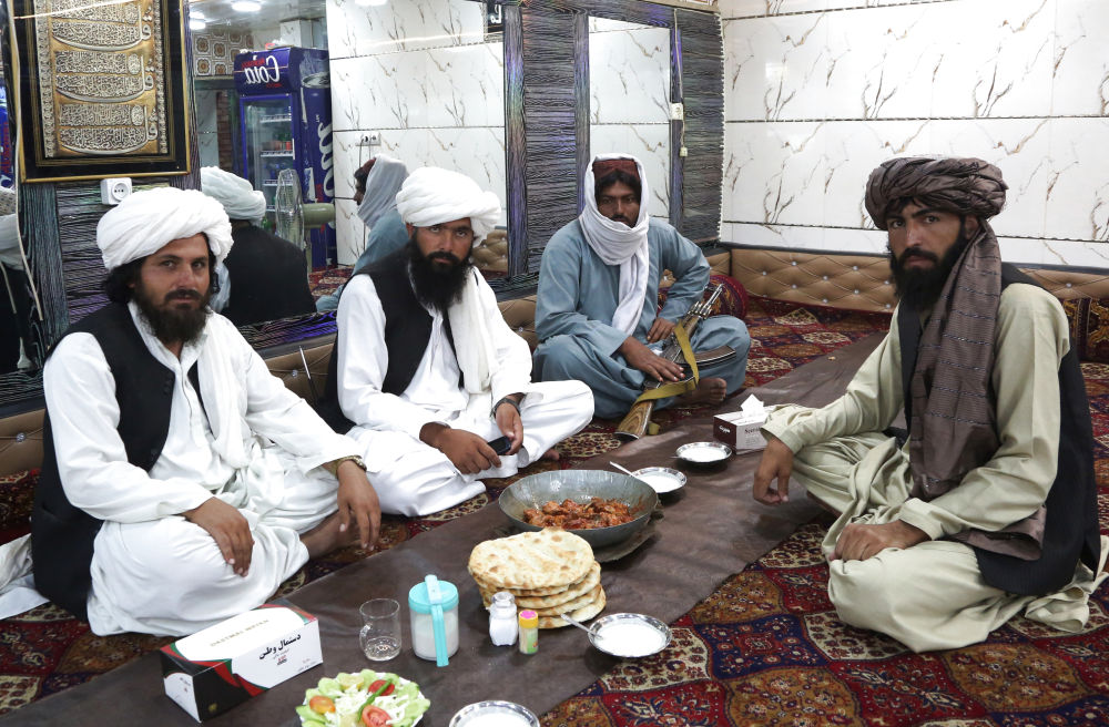 8月21日,几名塔利班成员在阿富汗喀布尔一家饭店用餐。(新华社发)
