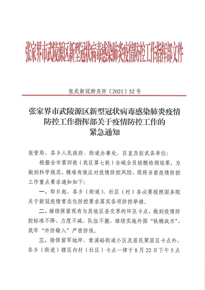 三、除保留军地坪、索溪峪街道小区及居民聚居区卡点外,各乡(街道)辖区内村(社区)卡点一律于8月22日下午5点撤销。城区的小区及居民聚居区卡点人员进出要严格落实“验码、测温、戴口罩”等常态化防疫措施,做好台账登记,严格管控外来人员进出。