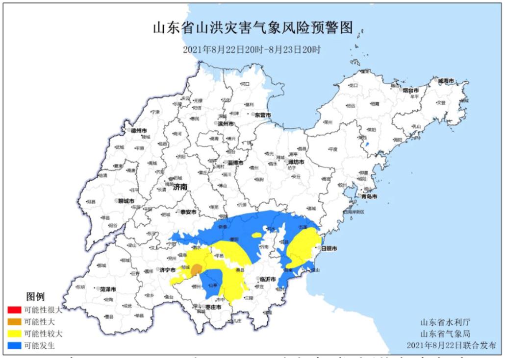 22日18时,山东省水利厅和山东省气象局联合发布山洪灾害气象预警:预计8月22日20时至8月23日20时,济宁、枣庄等市局部地区发生山洪灾害的可能性大(橙色预警),临沂、日照、济宁、枣庄等市局部地区发生山洪灾害的可能性较大(黄色预警),临沂、泰安、济宁、日照、枣庄、淄博、烟台、潍坊等市局部地区可能发生山洪灾害(蓝色预警)。