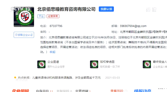 然而,2020年年底,颐泽英语突然发布通知停课,随后老师和管理人员先后失联,此时家长们才发现,负责运营颐泽英语的只是一家教育咨询公司,根本没有取得办学许可,公司眼下已经因无法联系被列入经营异常名单。