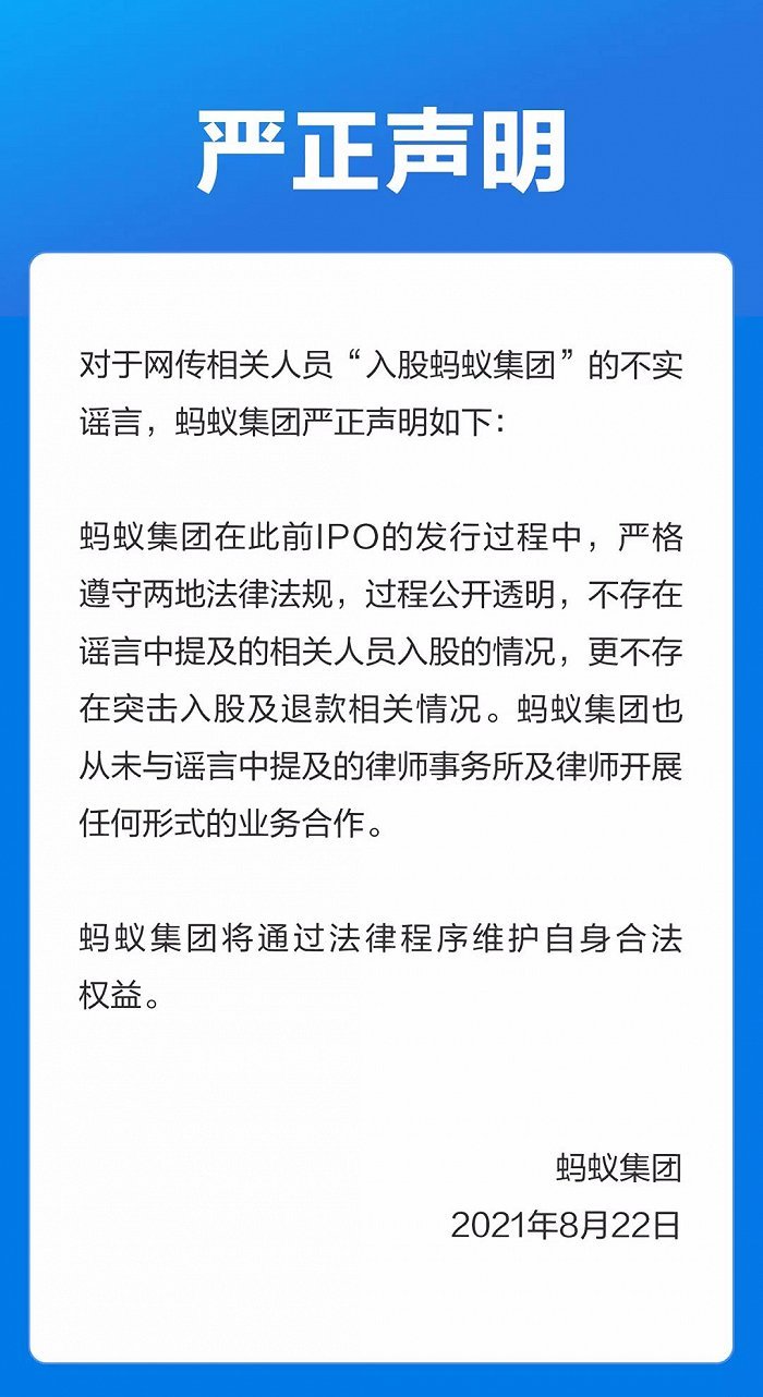 8月22日晚间,蚂蚁集团在其官方微信公众号发布声明。声明称,对于网传相关人员“入股蚂蚁集团”的不实消息,蚂蚁集团辟谣称,蚂蚁集团在此前IPO发行过程中,严格遵守两地法律法规,过程公开透明,不存在谣言中提及的相关人员入股情况,更不存在突击入股及退款相关情况。蚂蚁集团也从未与谣言中提及的律师事务所及律师展开任何形式的业务合作。