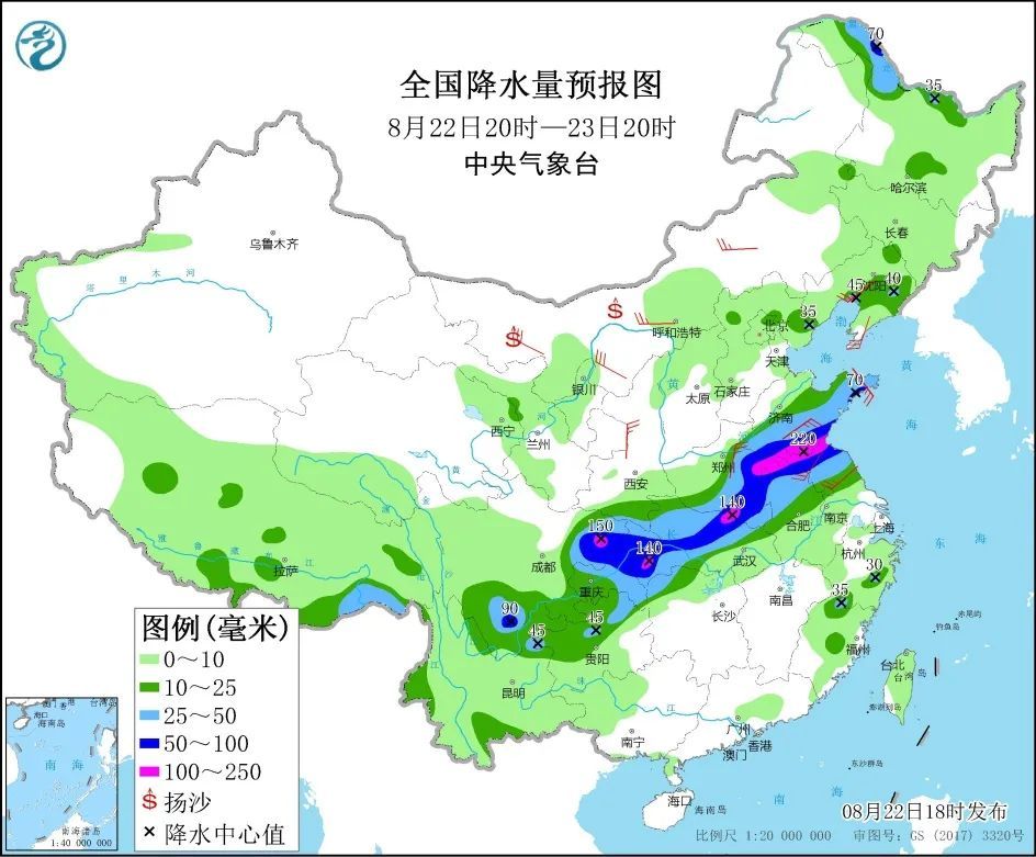 8月22日20时至23日20时,黑龙江西北部、辽宁东部、西藏南部、黄淮大部、江淮北部、江汉中西部、西南地区东部、四川南部等地部分地区有中到大雨,其中,山东南部、河南东部和南部、安徽北部、江苏北部、湖北中部和西南部、四川东北部和南部、重庆中北部等地部分地区有暴雨或大暴雨。
