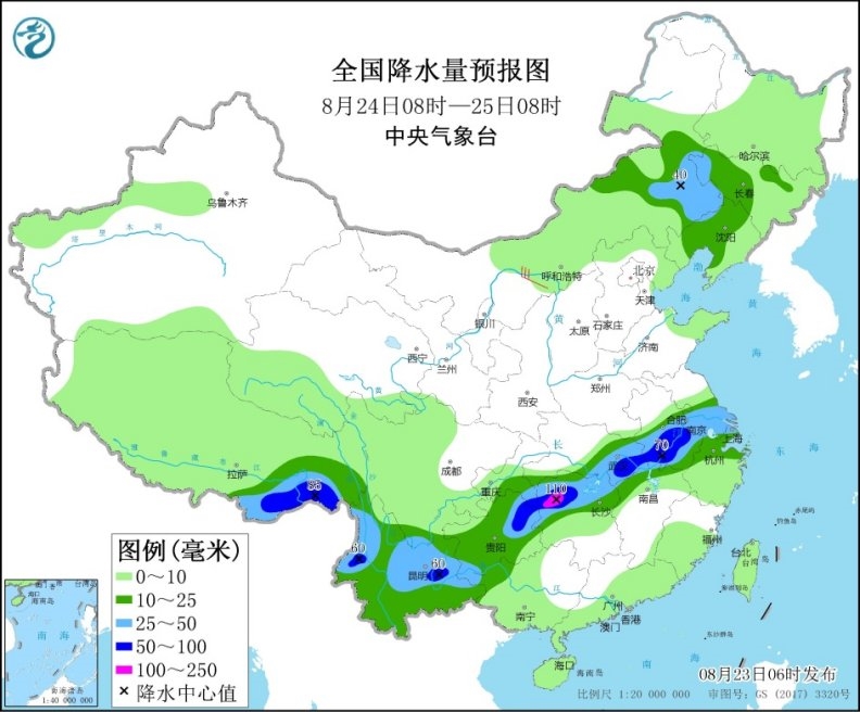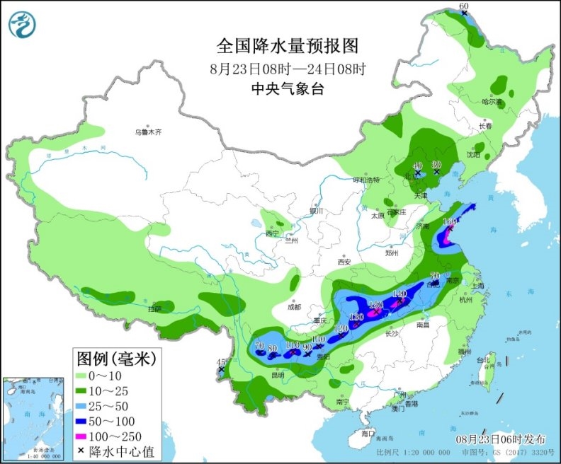 今(8月23日)明天强降雨区域将东移南压,山东、安徽、湖北、湖南、重庆等地有暴雨或大暴雨。此外,内蒙古、东北地区一带,受低涡影响,未来几天降雨仍频繁,也需注意防范。
