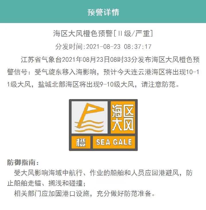 江苏省气象台2021年08月23日8时33分发布海区大风橙色预警信号:受气旋东移入海影响,预计今天连云港海区将出现10~11级大风,盐城北部海区将出现9~10级大风,请注意防范。