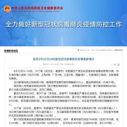 #22日无新增本土确诊病例#【#22日新增确诊病例21例均为境外输入#】据国家卫生健康委员会网站,8月22日0—24时,31个省(自治区、直辖市)和新疆生产建设兵团报告新增确诊病例21例,均为境外输入病例(广东5例,上海4例,天津3例,云南3例,北京2例,山西1例,浙江1例,河南1例,四川1例);无新增死亡病例;新增疑似病例1例,为境外输入病例(在上海)。