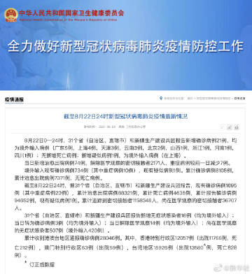 截至8月22日24时,据31个省(自治区、直辖市)和新疆生产建设兵团报告,现有确诊病例1695例(其中重症病例23例),累计治愈出院病例88321例,累计死亡病例4636例,累计报告确诊病例94652例,现有疑似病例1例。累计追踪到密切接触者1158348人,尚在医学观察的密切接触者36707人。
