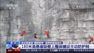 要在180米高的悬崖陡壁上整体铺设主动防护网,这在国内还没先例。一群艺高胆大的“蜘蛛人”就这样将身体悬挂在安全绳上,在崖壁上穿行,清理危岩、打刷坡面、钻孔安装锚杆、穿绳挂网,把4万多平米的钢丝网牢牢地罩在了整个崖壁上。