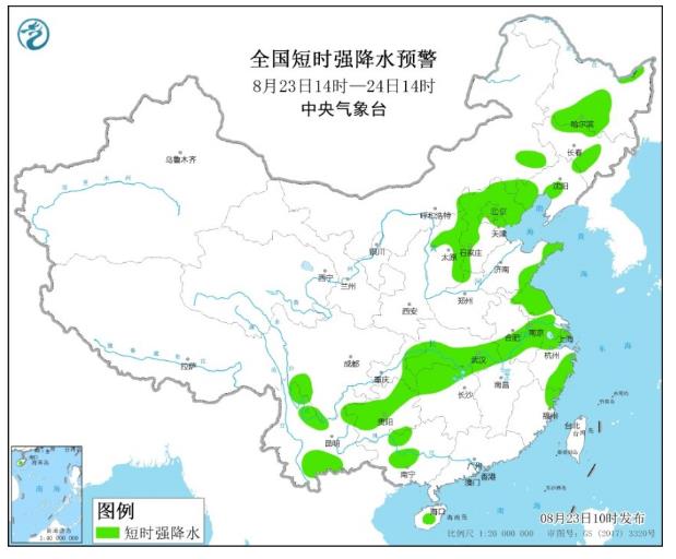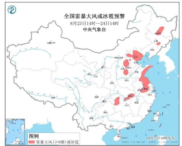央视网消息:据中国天气网消息,中央气象台8月23日10时发布强对流天气蓝色预警:预计8月23日14时至24日14时,黑龙江南部、吉林东南部、辽宁西南部、山西东部、河北北部和西部、北京、天津中北部、山东东南部、河南西北部、安徽东南部、江苏、湖北东南部、湖南北部等地的部分地区将有8-10级雷暴大风或冰雹天气;内蒙古东南部、黑龙江中部、吉林北部和东南部、辽宁南部、山西北部和东部、河北中北部和西部、北京、天津、山东东南部、安徽中南部、江苏、上海、湖北、湖南北部、浙江、福建东北部、四川南部、重庆东部、贵州、云南北部和南部、广西中部、海南等地的部分地区将有短时强降水天气,小时雨量20-60毫米,局地可达70毫米以上。
