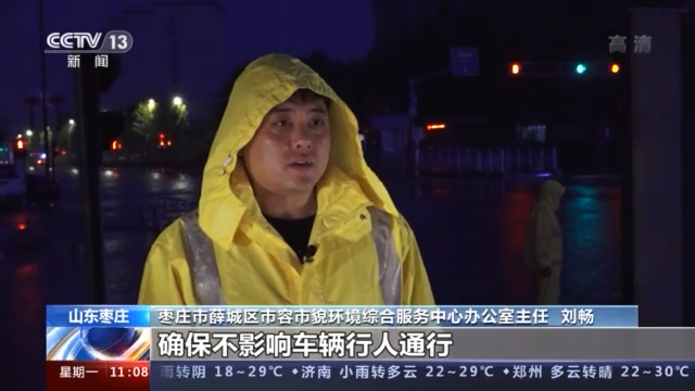 枣庄市薛城区市容市貌环境综合服务中心办公室主任 刘畅:根据这次强降雨,我站从凌晨2点组织八个队伍,分散到各个易涝点实施抢险排水任务,对主路积水严重的地方,主要实施了用抽水泵抽水的方式,缓解主路面积水严重,确保不影响车辆行人通行。