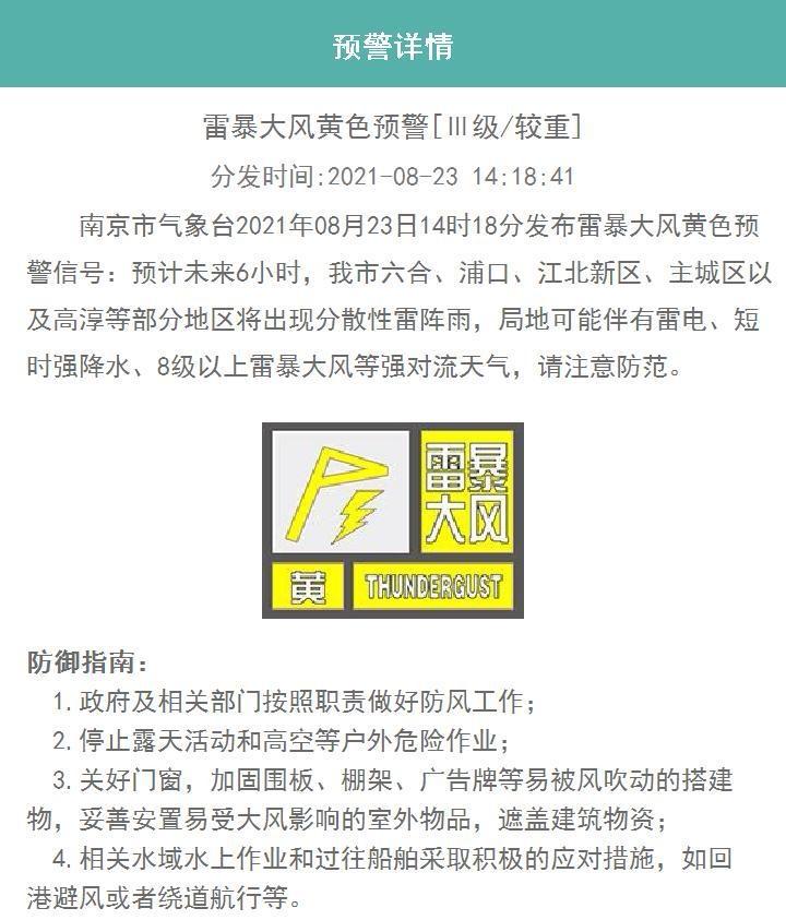 江苏省南京市气象台2021年8月23日14时18分发布雷暴大风黄色预警信号:预计未来6小时,南京市六合、浦口、江北新区、主城区以及高淳等部分地区将出现分散性雷阵雨,局地可能伴有雷电、短时强降水、8级以上雷暴大风等强对流天气,请注意防范。