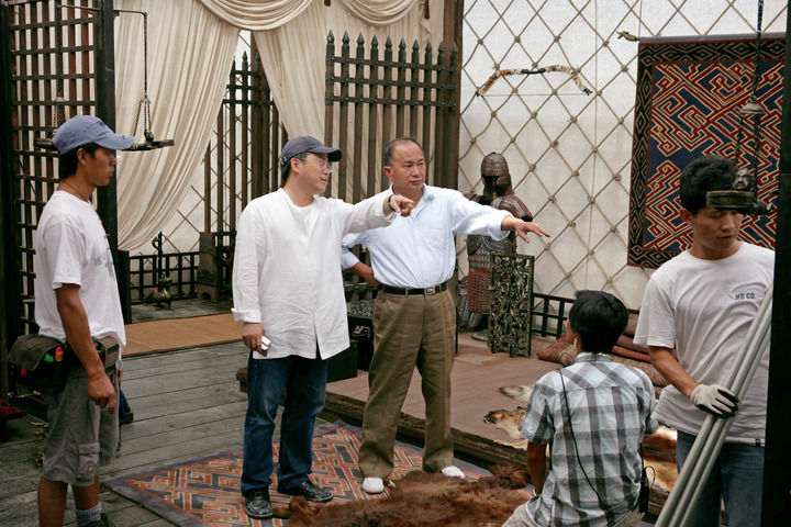 △叶锦添(左二)与导演吴宇森(中)在电影《赤壁》拍摄期间交流。新华社发(受访者提供)
