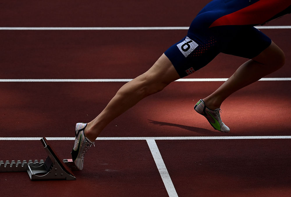 8月3日,获得冠军的挪威选手瓦霍尔姆在男子400米栏比赛中起跑。