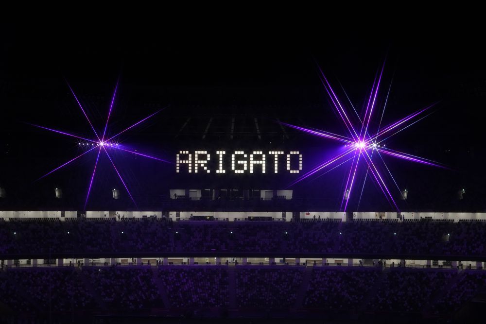 8月8日,第32届夏季奥林匹克运动会闭幕式在日本东京举行。这是大屏幕上显示感谢字样。