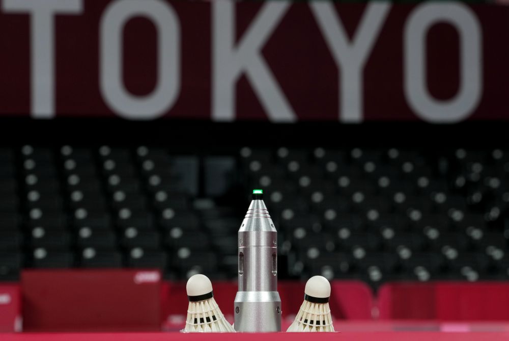 7月25日,在位于东京的武藏野森林体育广场羽毛球比赛中,主办方采用无接触续球装置向运动员提供新的羽毛球。
