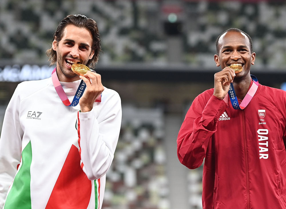 8月2日,意大利选手坦贝里(左)和卡塔尔选手巴希姆在男子跳高颁奖仪式上共同展示金牌。