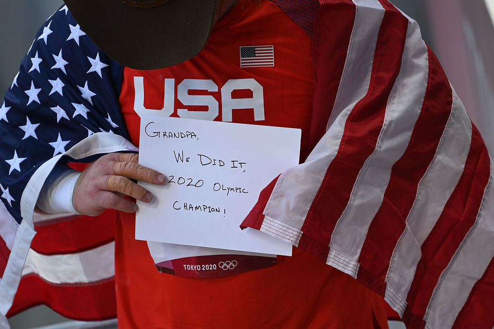 8月5日,美国选手克劳瑟夺得男子铅球冠军后,在胸前展示写有“祖父,我们做到了,2020奥运会冠军!”字样的纸条。