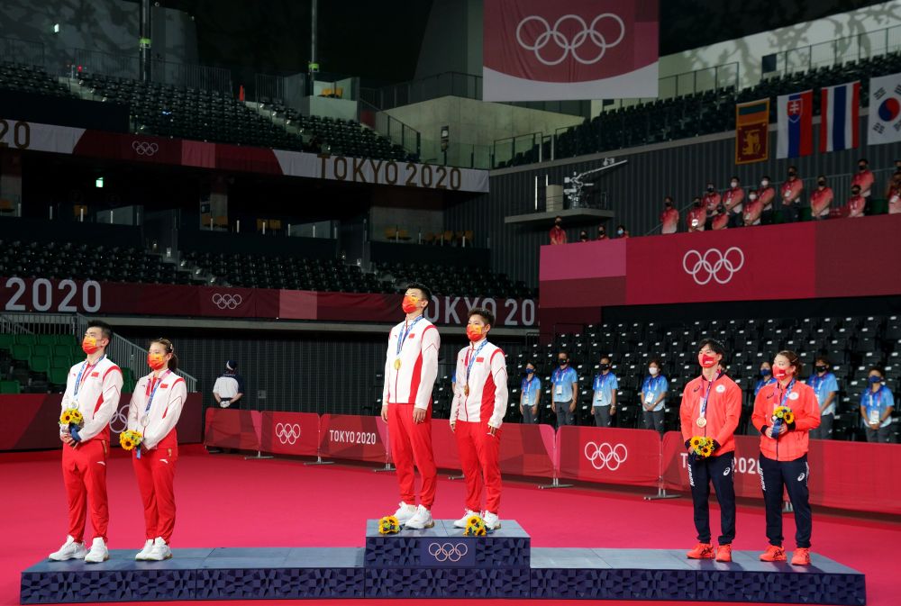 7月30日,冠军中国选手王懿律(左三)/黄东萍(右三)、亚军中国选手郑思维(左一)/黄雅琼(左二)和季军日本选手渡边勇大(右二)/东野有纱在东京奥运会羽毛球混合双打颁奖仪式上。