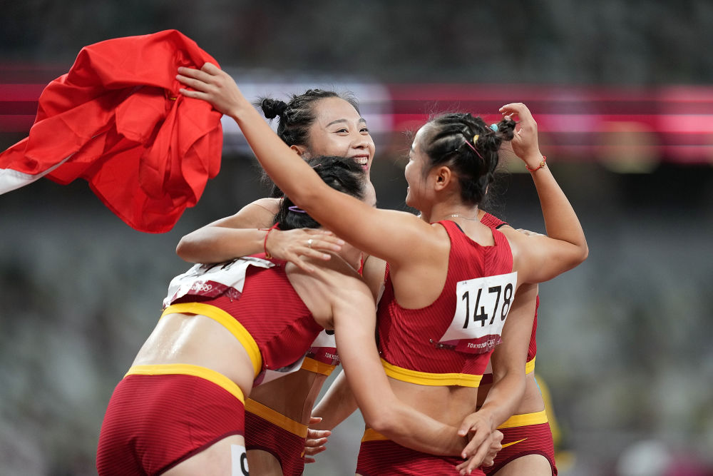 8月6日,中国队队员在比赛后。当日,东京奥运会田径女子4x100米接力决赛在新国立竞技场举行。梁小静、葛曼棋、黄瑰芬、韦永丽组成的中国女队拼下第六,42秒71的成绩创下队伍赛季最佳。