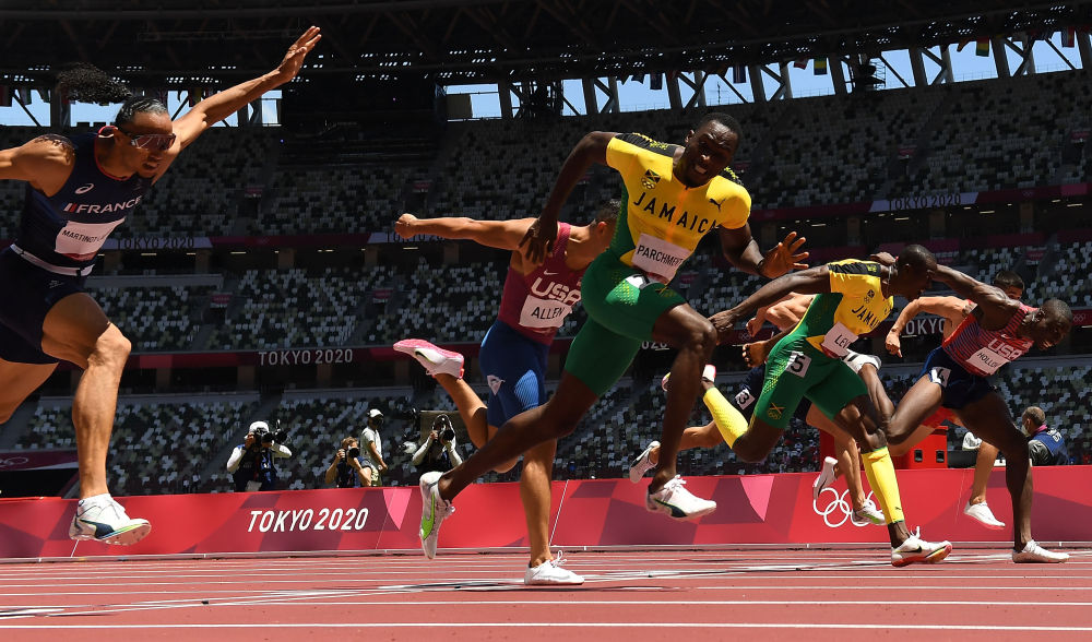 8月5日,牙买加选手帕奇门特(前)在男子110米栏决赛中。