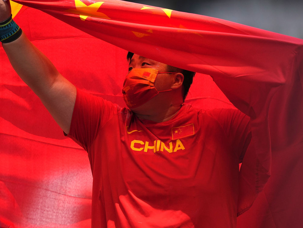8月1日,巩立姣庆祝胜利。当日,在东京奥运会田径女子铅球决赛中,中国选手巩立姣夺得冠军。