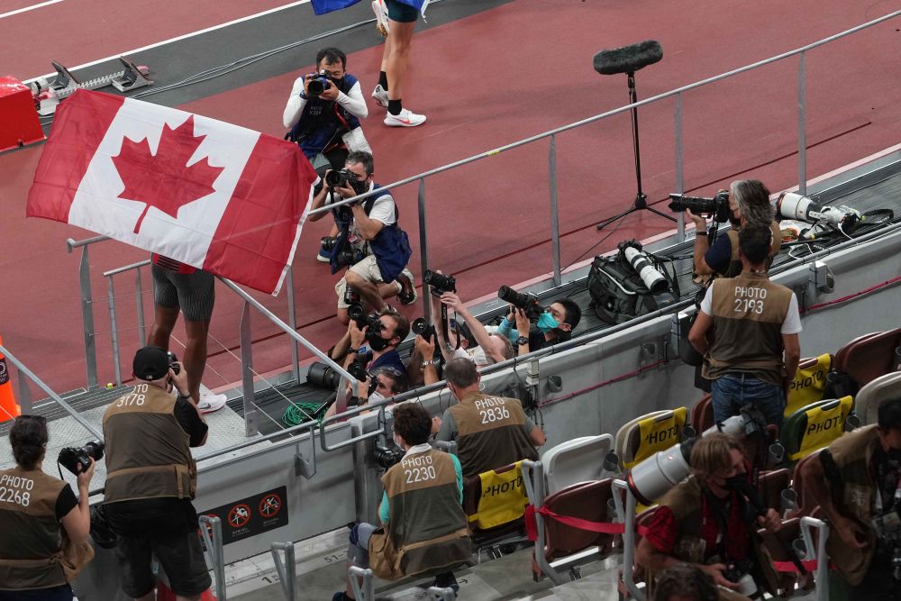8月5日,新华社记者李一博在拍摄获得男子十项全能冠军的加拿大选手达米安·华纳。