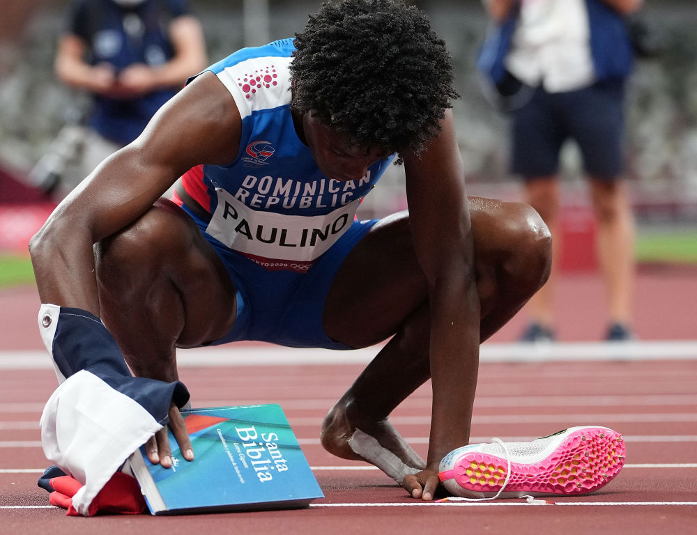 8月6日,多米尼加选手保利诺在女子400米决赛后。(她手中的圣经是身在地沟拍摄位置的我从看台接下后递给她的。)