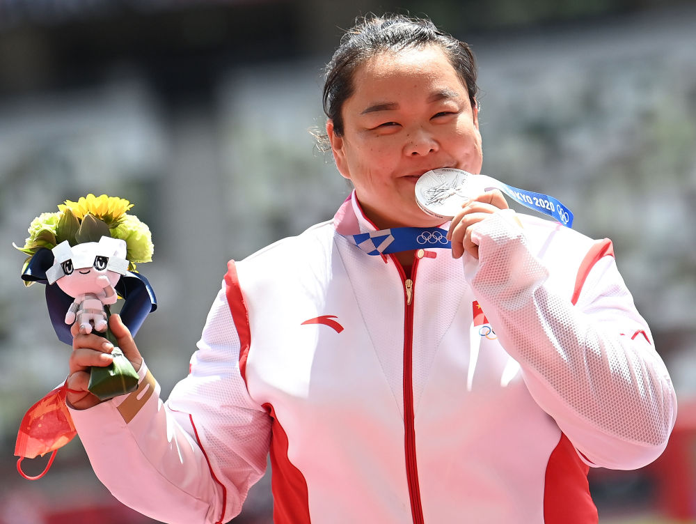 8月4日,中国选手王峥在女子链球颁奖仪式上。王峥在东京奥运会女子链球决赛中获得银牌。