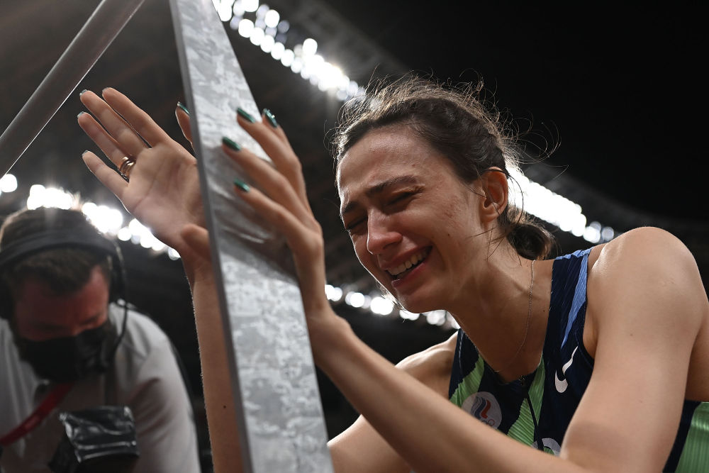 8月7日,俄罗斯选手拉西茨克涅在女子跳高决赛夺冠后喜极而泣。