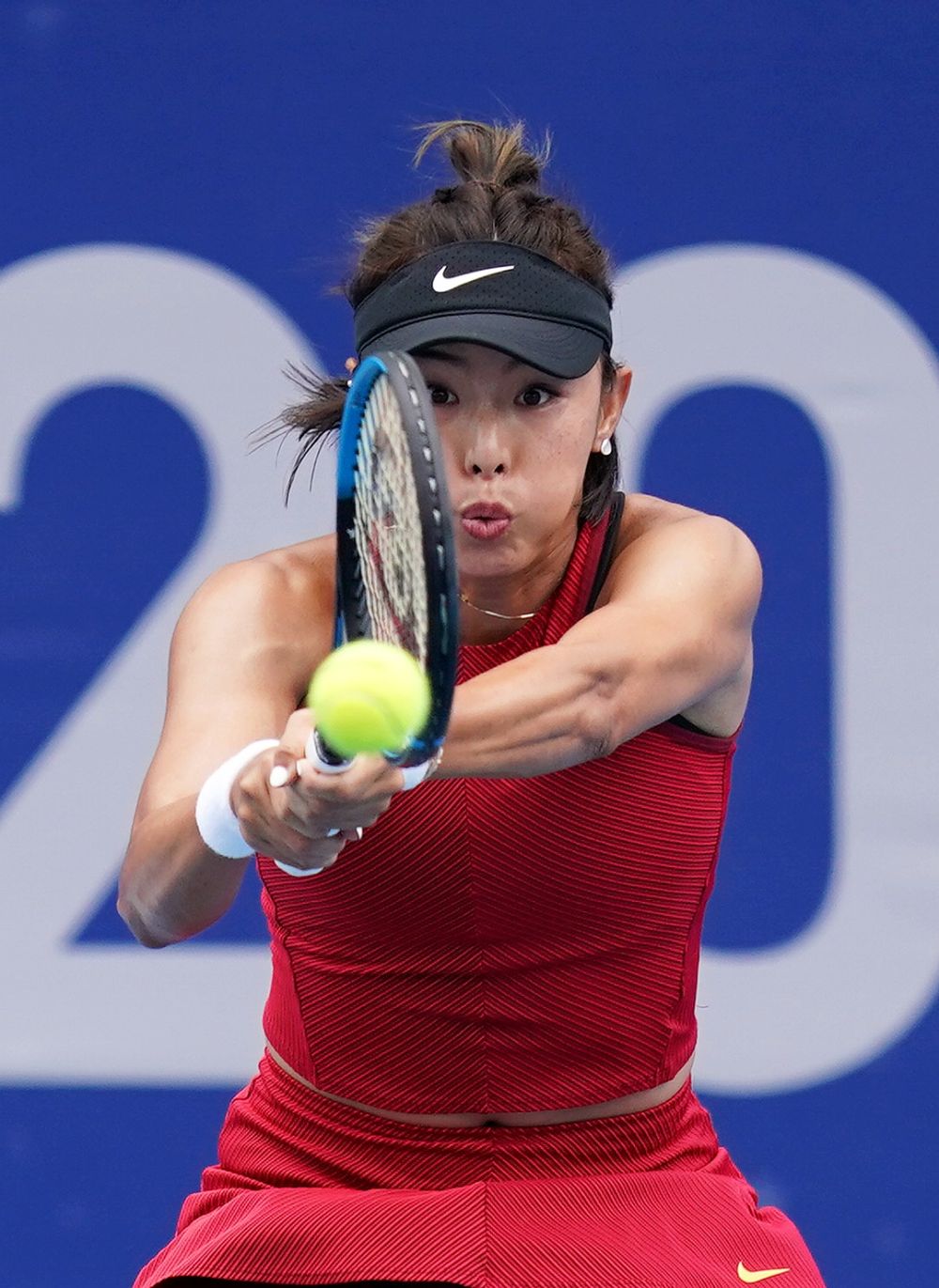 7月26日,王蔷在比赛中回球。当日,在东京奥运会网球女子单打第二轮比赛中,中国选手王蔷不敌西班牙选手加尔比妮·穆古拉扎。