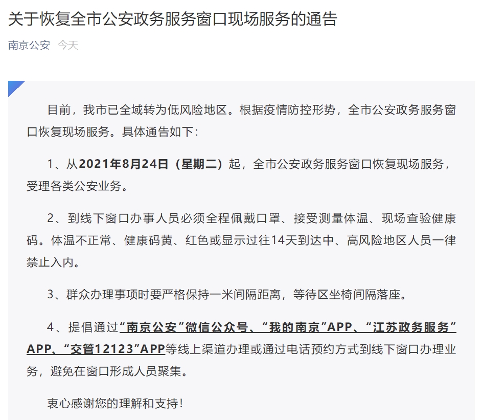 南京市公安局8月23日发布通告,目前,南京市已全域转为低风险地区。根据疫情防控形势,南京全市公安政务服务窗口恢复现场服务。具体通告如下:
