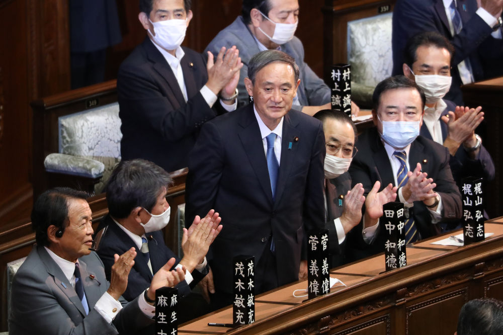 2020年9月16日,在位于东京的日本国会众议院,新当选的日本第99任首相、自民党总裁菅义伟(中)起身致谢。(新华社记者杜潇逸摄)