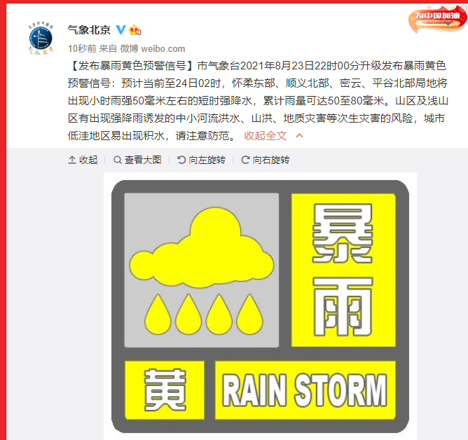 根据气象北京消息,北京市气象台2021年8月23日22时升级发布暴雨黄色预警信号:预计当前至24日02时,怀柔东部、顺义北部、密云、平谷北部局地将出现小时雨强50毫米左右的短时强降水,累计雨量可达50至80毫米。山区及浅山区有出现强降雨诱发的中小河流洪水、山洪、地质灾害等次生灾害的风险,城市低洼地区易出现积水。