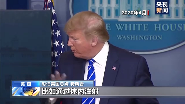 时任美国总统 特朗普:我看到消毒剂在一分钟内就把病毒消灭了, 只用了一分钟,那有没有一种方法能达到这种效果呢? 比如通过体内注射,或者类似清洗的方式。