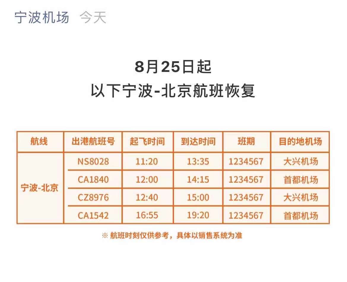宁波栎社国际机场今天(24日)发布消息,8月25日起,宁波-北京部分航班恢复。