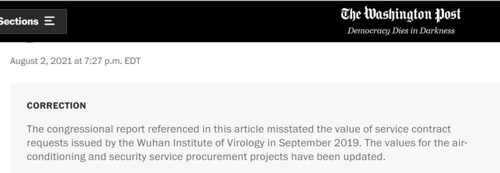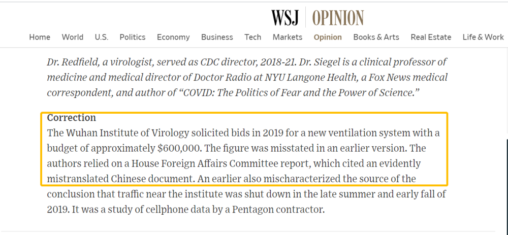 20日,《华尔街日报》上述文章页面已刊登更正,并指出错误来源于国会报告:“武汉病毒所在2019年招标购买通风系统的预算大约为60万美元。这个数字在之前的版本里被错误描述了。(本文)作者依赖了一份众议院外交关系委员会报告,该报告引用了一份被明显错译的中国文件。”
