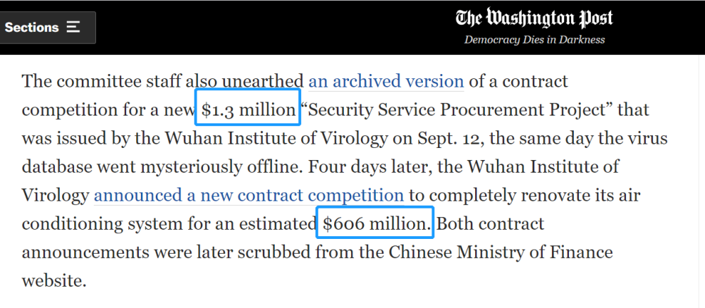 记者想起,《华盛顿邮报》在月初也登出一篇有关武汉病毒所的言论文章,翻查之后发现,果然也有这么个数字:“武汉病毒所曾在2019年9月提出,通过竞争性谈判改造其空调系统,耗资6.06亿美元。”