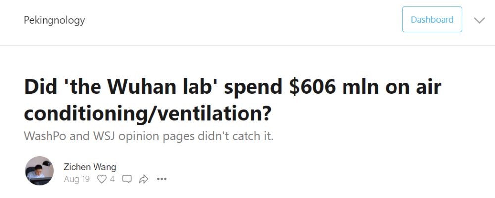 8月17日,新华社记者看到《华尔街日报》一篇言论文章里的一个重要数字,顿时心生疑窦:“它(武汉病毒所)曾提出要求,花费超过6亿美元建一个新的通风系统”。
