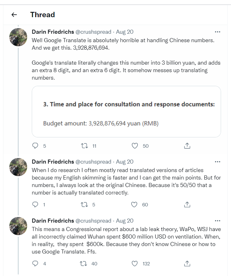 这位名为Darin Friedrichs的网友连发了二十多条推特分析这个错误和新华社记者英文文章。据他分析,美国国会报告的作者可能是使用了“谷歌翻译”对中文进行了翻译,然后未加核实直接引用。然而,“谷歌翻译”可能把人民币“392.687694万元(人民币)”里的“万”字给删了,然后又“无视”了小数点,一来一去使得最终的数字差了1000倍。