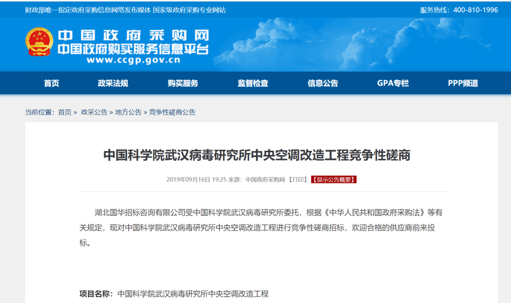 武汉病毒所真提出过要花将近39.3亿人民币改造中央空调?循报告脚注和网上搜索,新华社记者找到了当时的招标文件。
