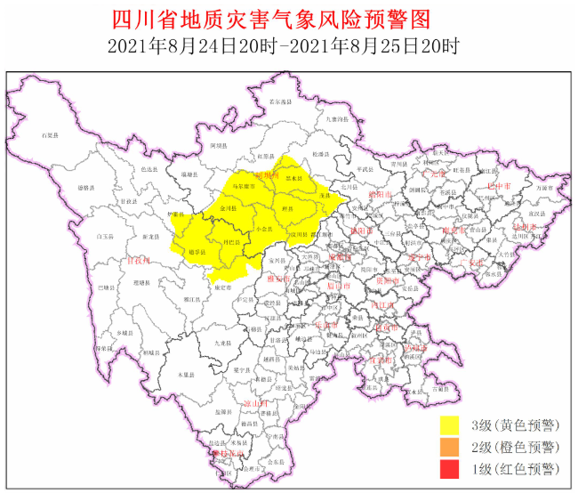 四川省地质灾害指挥部办公室17时发布全省地质灾害气象风险预警,8月24日20时至8月25日20时,四川3级黄色预警区域为阿坝州马尔康市、汶川县、理县、茂县、松潘县、金川县、小金县、黑水县、壤塘县、红原县,甘孜州康定市、丹巴县、道孚县、炉霍县、新龙县等2州15个县(市),预警范围由之前4个县区扩大到15个县(市)。