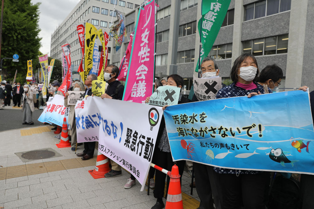 4月13日,抗议者在日本东京的首相官邸外反对福岛核污水排入大海。无视国内国际舆论的质疑和反对,日本政府13日召开有关内阁会议正式决定将福岛第一核电站上百万吨核污水经过滤并稀释后排入大海,排放将于约2年后开始。(新华社记者杜潇逸摄)