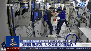 另外一名队友刘伯明则拿着采血器进行采血,采血量在一管左右,等采血量满足要求后拔出针管,太空采血项目就完成了。