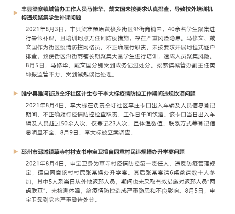 上述3起典型问题,有的违反工作纪律,防控工作期间午间饮酒;有的工作不认真不严格,未能及时发现聚集性风险隐患;还有的滥用职权、纵容违规操办升学宴、谢师宴。疫情防控复杂严峻形势下,个别党员干部仍然置党中央和省市委三令五申于不顾,履职尽责不到位,工作作风不扎实,存在严重的形式主义、官僚主义问题,受到严肃查处完全是咎由自取,教训极其深刻。