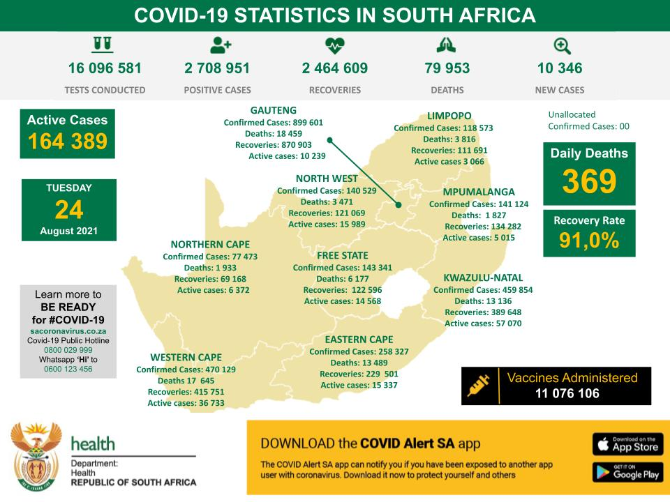 当地时间8月24日,南非卫生部确认,南非当天新增新冠肺炎确诊病例10346例,累计确诊2708951例。