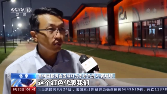 首钢园服贸会区域灯光系统负责人 黄建明:预计在25日灯光调试工作能完成,灯光主要是以红色背景为主。这个红色代表我们钢的颜色、火的颜色,整个场馆会体现出一种红红火火的状态。