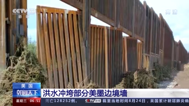 照片显示,在亚利桑那州南部与墨西哥接壤的道格拉斯市,边境墙的多处金属栅栏被洪水冲垮,一些金属栅栏从铰链上脱落,倚靠在金属框架上,栅栏底部堆满了洪水裹挟而来的植物枝叶,还有洪水退去留下的碎石和泥巴。