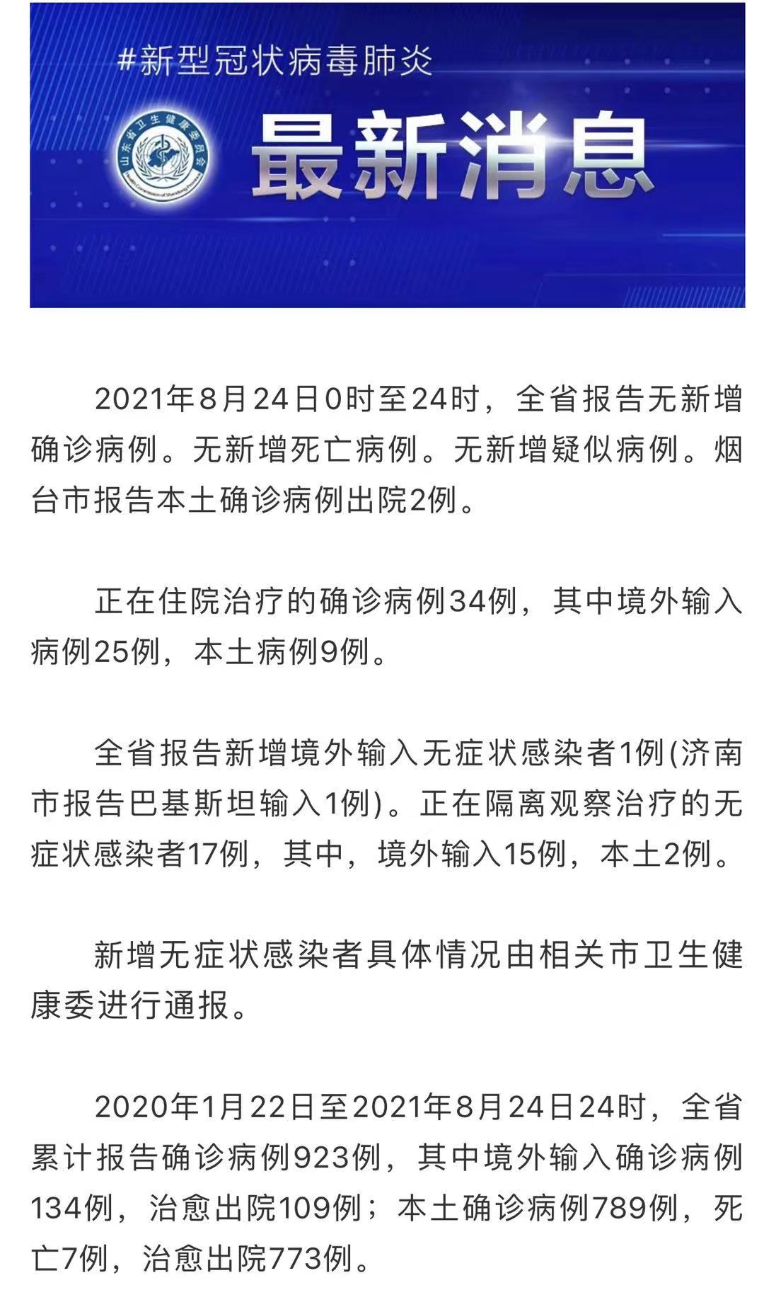 2021年8月24日0时至24时,山东全省报告无新增确诊病例,无新增死亡病例,无新增疑似病例。烟台市报告本土确诊病例出院2例。