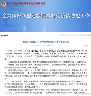 截至8月24日24时,据31个省(自治区、直辖市)和新疆生产建设兵团报告,现有确诊病例1575例(其中重症病例14例),累计治愈出院病例88496例,累计死亡病例4636例,累计报告确诊病例94707例,现有疑似病例1例。累计追踪到密切接触者1159477人,尚在医学观察的密切接触者31718人。