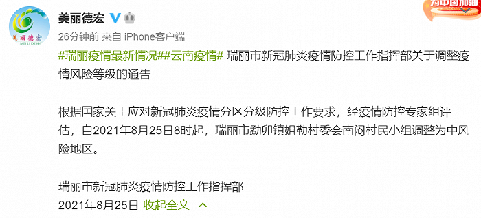 根据国家关于应对新冠肺炎疫情分区分级防控工作要求,经疫情防控专家组评估,自2021年8月25日8时起,瑞丽市勐卯镇姐勒村委会南闷村民小组调整为中风险地区。