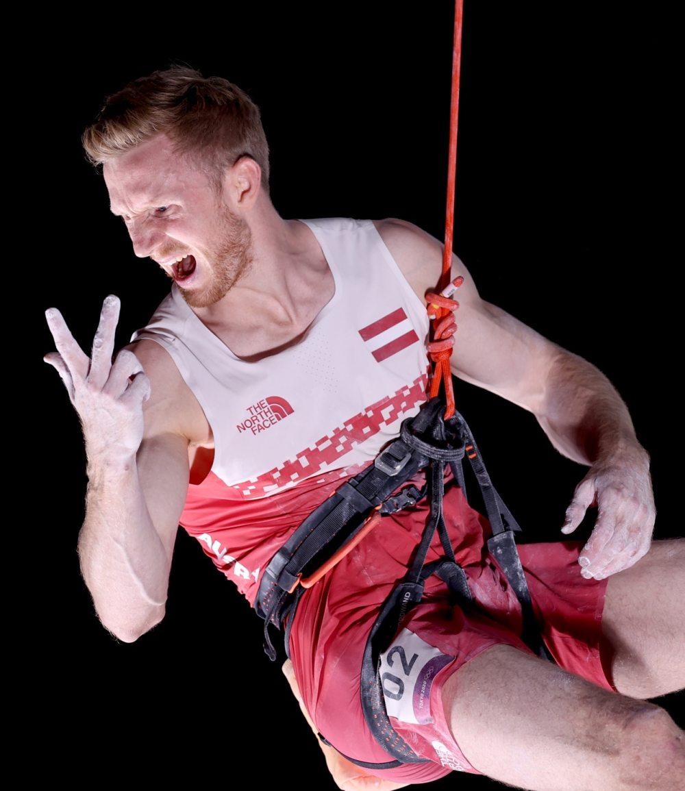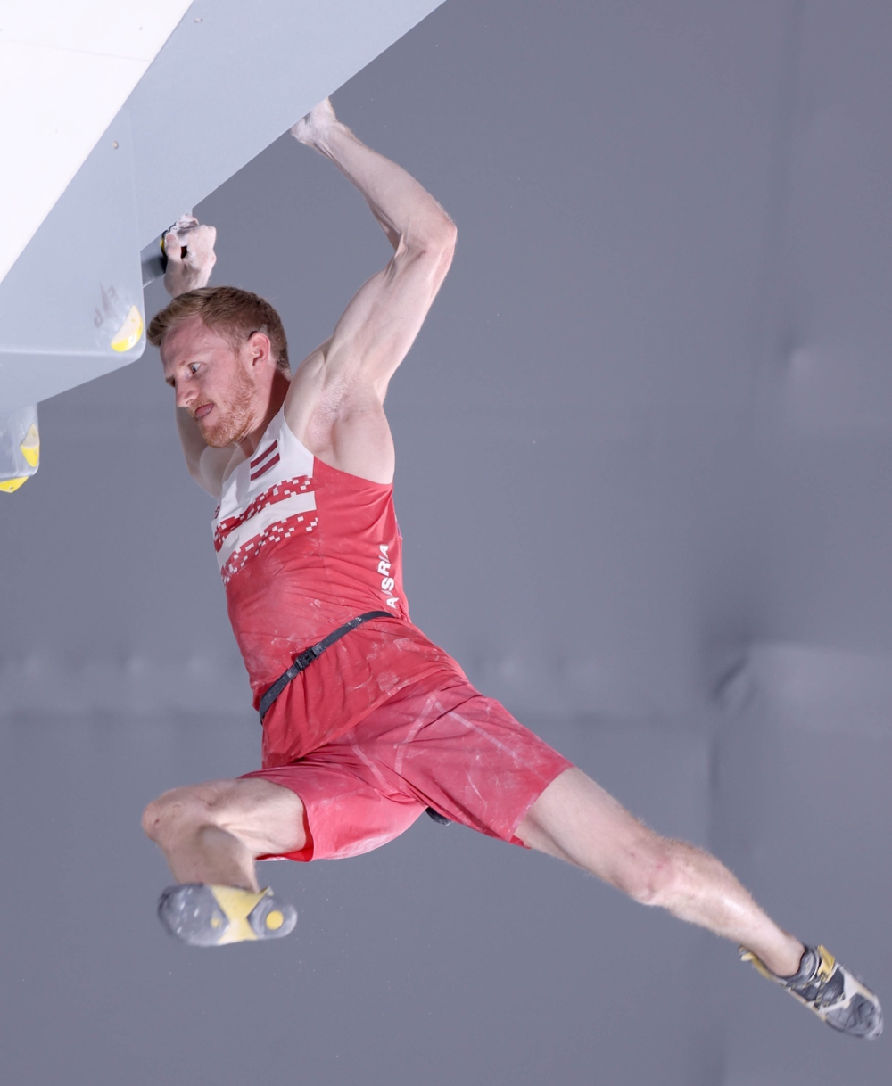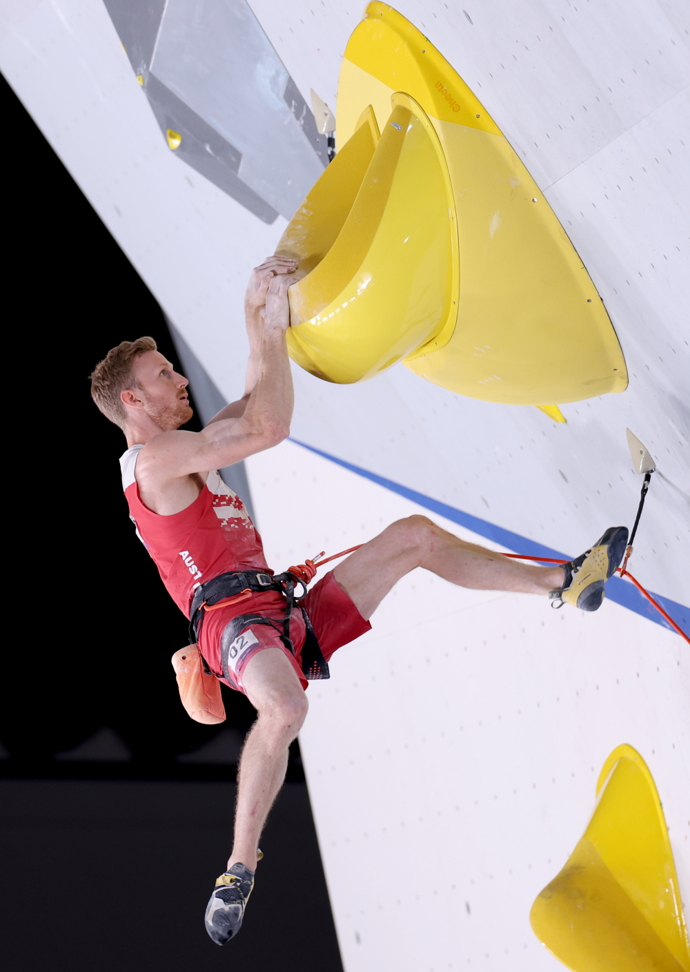 8月5日,奥地利选手雅各布·舒伯特在男子全能攀石项目的比赛中。